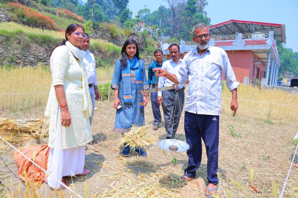 जिलाधिकारी स्वाति एस. भदौरिया ने तहसील पौड़ी के अंतर्गत राजस्व ग्राम डोभाल ढांढरी का भ्रमण कर क्रॉप कटिंग प्रयोग का स्थलीय निरीक्षण किया। इस दौरान राजस्व विभाग की टीम द्वारा कृषक कुलदीप सिंह के खेत में मानक के अनुसार 30 वर्ग मीटर का प्लॉट बनाकर ‘सीसीई एग्री ऐप’ के माध्यम से वैज्ञानिक पद्धति से प्रयोग संपन्न किया गया, जिसके परिणाम स्वरूप 10.86 किलोग्राम गेहूं की उपज प्राप्त हुई।