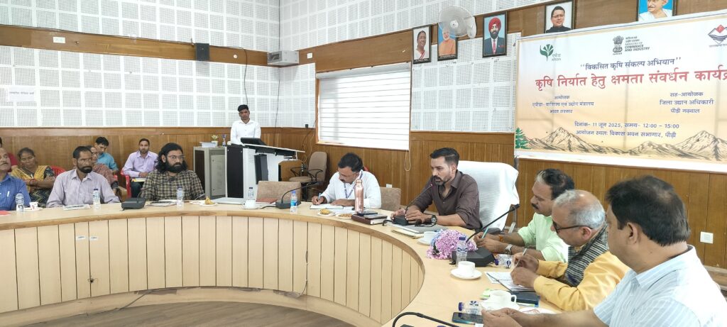 कृषि और प्रसंस्कृत खाद्य उत्पाद निर्यात विकास प्राधिकरण के उप महाप्रबंधक और क्षेत्रीय प्रमुख डॉ. सी.बी. सिंह ने कहा कि पौड़ी जिले में कृषि निर्यात की बड़ी संभावनाएं हैं। उन्होंने कीवी, माल्टा, हल्दी और पहाड़ी मसालों की अंतरराष्ट्रीय बाजार में बढ़ती मांग की जानकारी दी। साथ ही निर्यात की प्रक्रिया, आवश्यक दस्तावेज, गुणवत्ता मानक और प्रमाणन के विषय में भी विस्तृत जानकारी दी। उन्होंने बताया कि एपीडा के माध्यम से अब तक आम, लीची, ताजी सब्जियों और राजमा जैसे उत्पादों को वैश्विक बाजार में पहुंचाया गया है। वर्ष 2024-25 में भारत से 2.43 लाख करोड़ रुपये मूल्य के कृषि उत्पादों का निर्यात हुआ, जिसमें उत्तराखंड से 200 करोड़ का योगदान रहा।