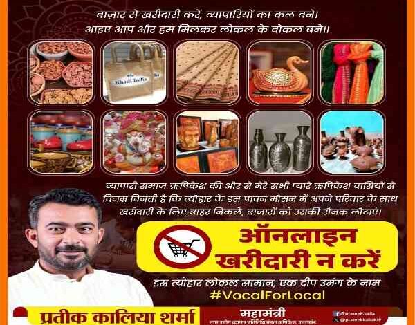 त्यौहारों का मौसम है चलिए इस बार एक छोटा कदम उठाकर अपने शहर ऋषिकेश की रौनक को वापस लाते हैं। परिवार के साथ बाहर निकलें, अपने ऋषिकेश के बाजारों में उमंग के दीप जलाएं और स्थानीय व्यापारियों का समर्थन करें। ऑनलाइन खरीदारी न करें, क्योंकि त्योहारों की असली चमक तभी लौटेगी जब हम अपने स्थानीय बाजारों को प्रोत्साहन देंगे। आपकी छोटी पहल से बाजारों में वहीं पुरानी रौनक फिर से लौट सकती है। महामंत्री नगर उद्योग व्यापार प्रतिनिधिमंडल ऋषिकेश प्रतीक कालिया शर्मा ने कहा कि इस बार के त्यौहारी मौसम में हम ऑनलाइन खरीदारी न कर अपने ऋषिकेश के लिए, अपने देश के लिए आइए मिलकर एक बेहतर शुरुआत करें।