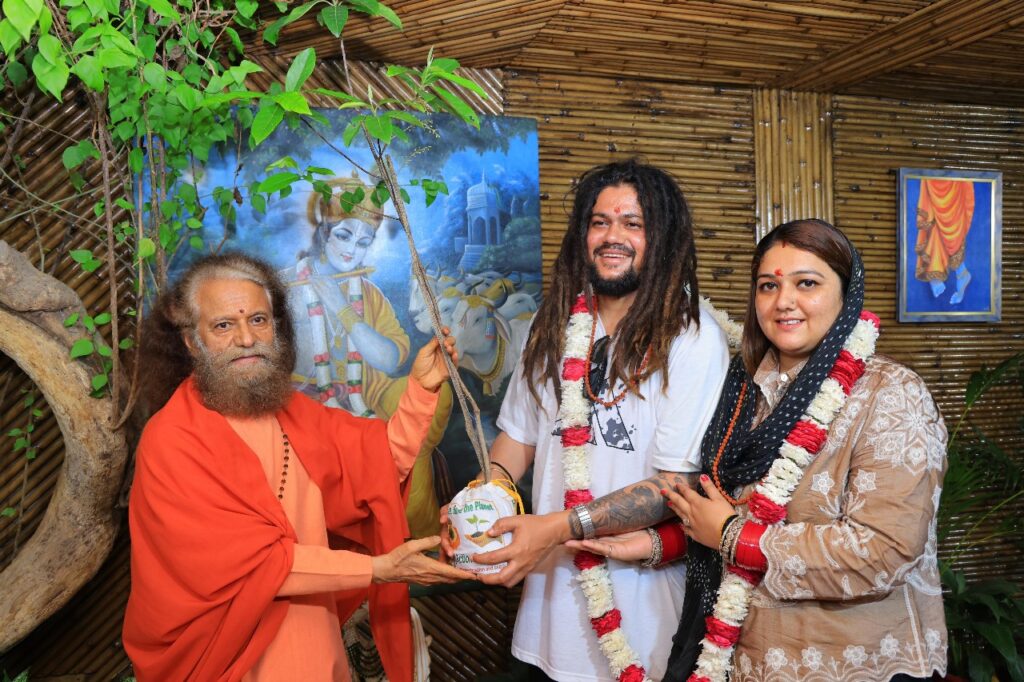 स्वामी जी ने हंसराज रघुवंशी को हिमालय की हरित भेंट रूद्राक्ष का पौधा भेंट किया।