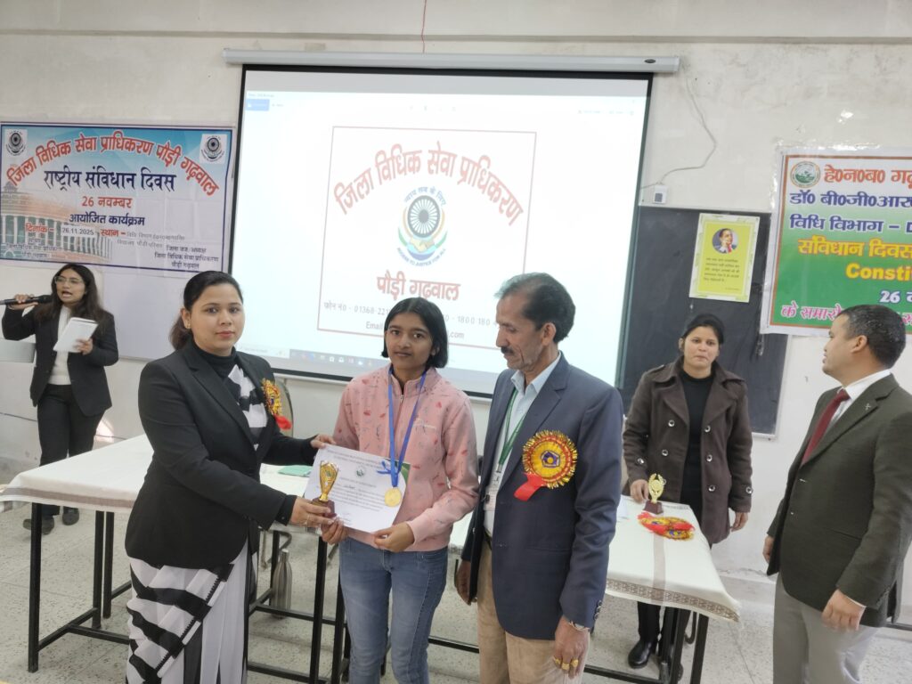 जिला विधिक सेवा प्राधिकरण के तत्वावधान में हेमवती नंदन बहुगुणा गढ़वाल विश्वविद्यालय परिसर में संविधान दिवस के अवसर पर विधिक जागरुकता एवं साक्षरता शिविर आयोजित किया गया। शिविर में छात्र–छात्राओं को नालसा विषय ‘एक मुट्ठी आसमान’ के अंतर्गत लोकपाल, नशा विरोधी चलचित्र, डाउन अभियान ‘तुम गिरना मत’ तथा नशा मुक्त भारत हेतु जागरुकता और स्वास्थ्य मार्गदर्शन विषय पर आधारित लघु चलचित्र दिखाया गया।