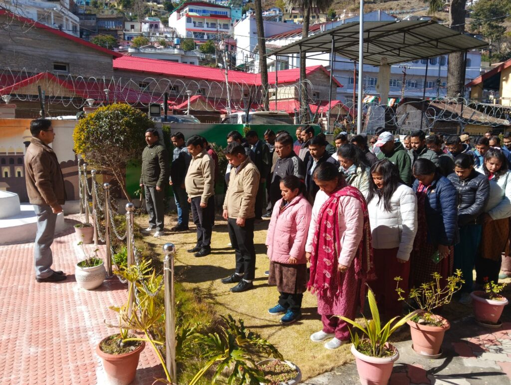 जिला मुख्यालय स्थित जिला कार्यालय परिसर में आयोजित कार्यक्रम में अपर जिलाधिकारी अनिल गर्ब्याल सहित जिला कार्यालय के अधिकारियों एवं कर्मचारियों द्वारा दो मिनट का मौन स्वतंत्रता संग्राम के शहीदों को श्रद्धांजलि अर्पित की गई तथा उनके सत्य, अहिंसा एवं राष्ट्र सेवा के आदर्शों को स्मरण किया गया।