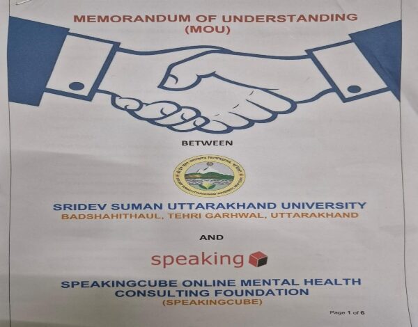 श्रीदेव सुमन उत्तराखंड विश्वविद्यालय, बादशाहीथौल, टिहरी गढ़वाल और स्पीकिंगक्यूब ऑनलाइन मेंटल हेल्थ कंसल्टिंग फाउंडेशन के बीच एक महत्वपूर्ण समझौता ज्ञापन (एमओयू) पर 21 अगस्त को हस्ताक्षर किए गए।